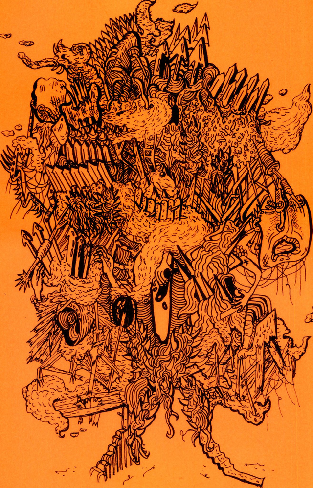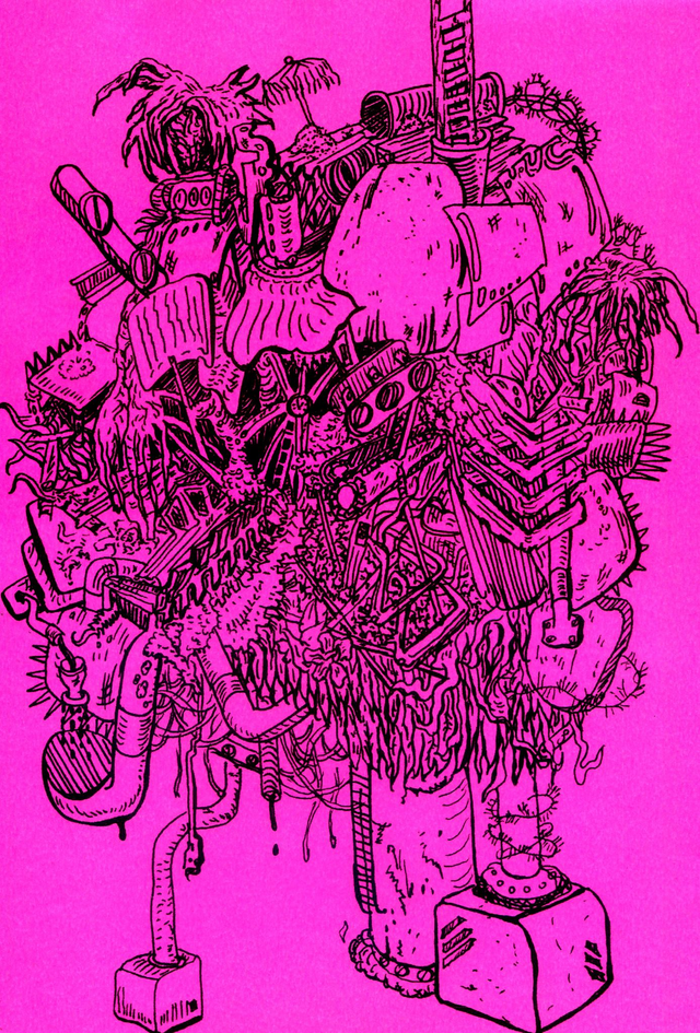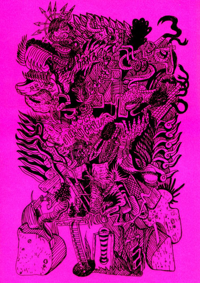 Dessins en noir et blanc de ruines sensibles sur papier fluo comme la fin du monde.